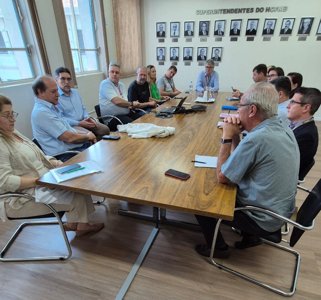 Participaram do encontro o Superintendente do HCFMB, José Carlos Souza Trindade Filho, o Chefe de Gabinete, João Henrique Castro, o Vice-Diretor da Faculdade de Medicina de Botucatu (FMB|Unesp), Pedro Lourenção, o Diretor do Hemocentro do HCFMB, Cláudio Lucas Miranda, e representantes do Laboratório Clínico, Engenharia, Administração Geral do Câmpus e Reitoria da Unesp.