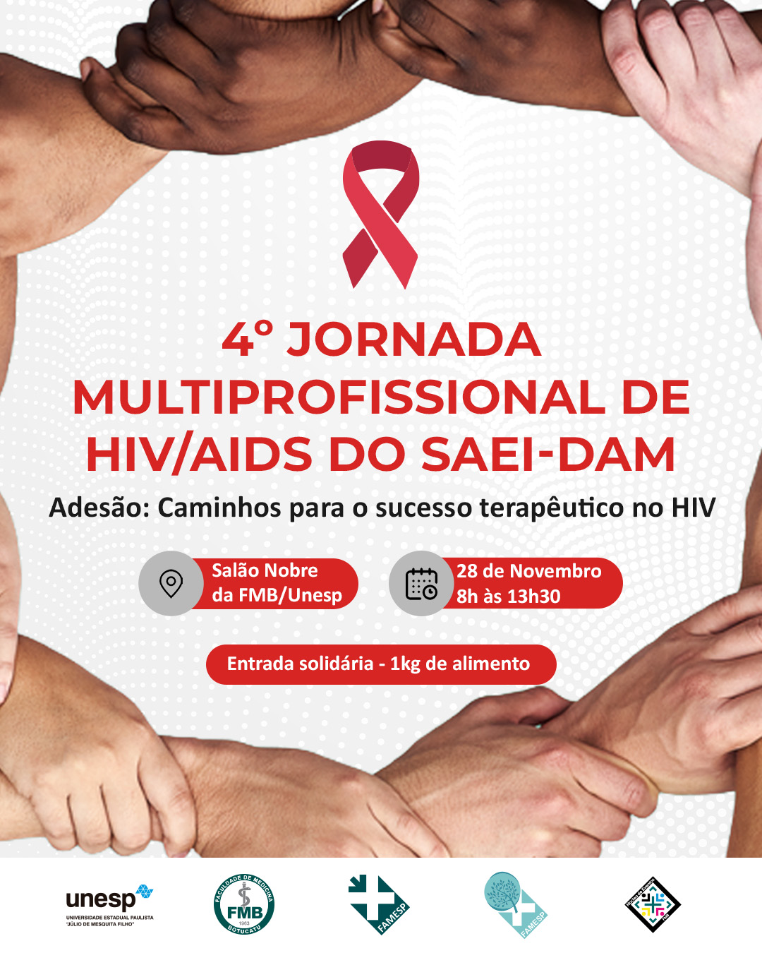 No dia 28 de novembro, o Serviço de Ambulatórios Especializados em Infectologia “Domingos Alves Meira” (SAEI/DAM), unidade própria da Fundação para o Desenvolvimento Médico e Hospitalar (Famesp), realizará a quarta edição da Jornada Multiprofissional de HIV/aids. O encontro será das 8h às 13h30, no salão nobre da Faculdade de Medicina de Botucatu (FMB/Unesp). Em 2025, o evento abordará o tema “Adesão: Caminhos para o Sucesso Terapêutico no HIV”, por meio de uma programação completa, com especialistas compartilhando conhecimentos e experiências práticas.